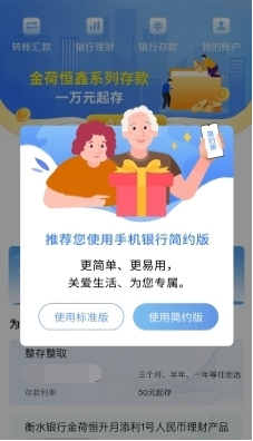 衡水銀行圍繞數(shù)字智能化服務(wù)轉(zhuǎn)型,優(yōu)化完善了符合老年人需求的數(shù)字化金融服務(wù)體系,針對(duì)老年客群的業(yè)務(wù)特點(diǎn),從視覺交互、客戶關(guān)懷、安全性等方面著眼,打造了“老年版手機(jī)銀行”。“老年版手機(jī)銀行”整體設(shè)計(jì)風(fēng)格以大字、簡(jiǎn)單、實(shí)用為宗旨,功能模塊、界面設(shè)計(jì)凸顯清晰、大大方便了老年人查看、使用。